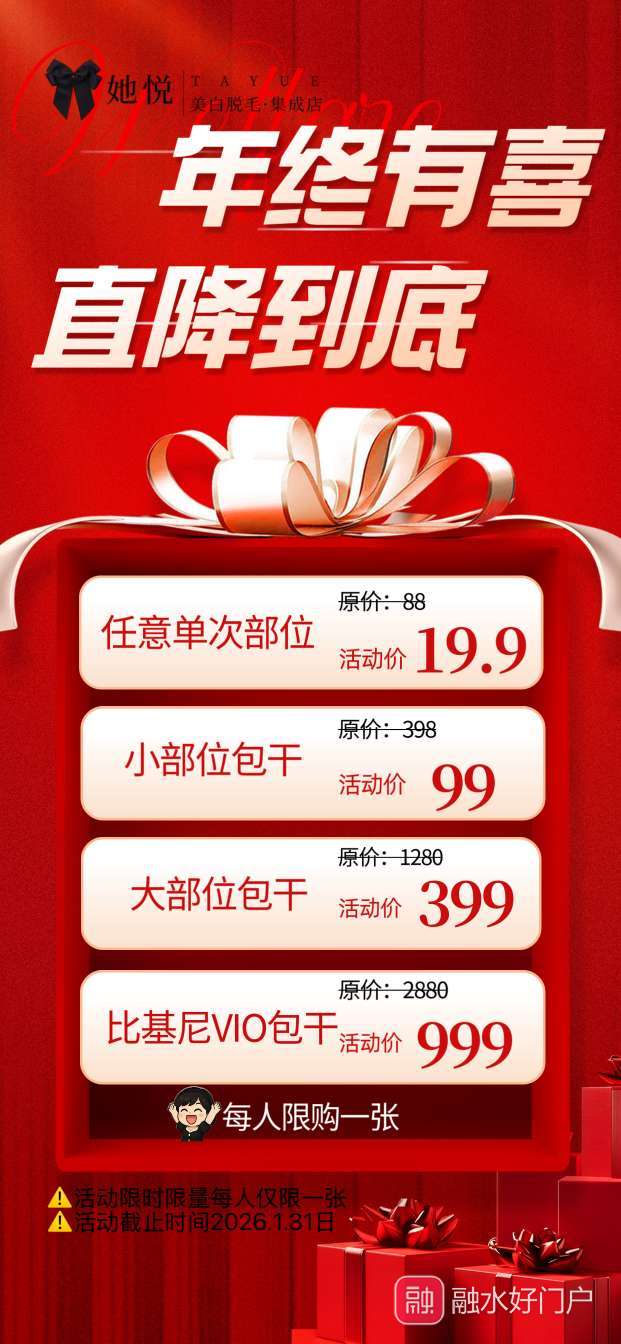 她悦脱毛年终特惠来袭,19.9元就能体验单次脱毛,包干项目更是直降千元!
