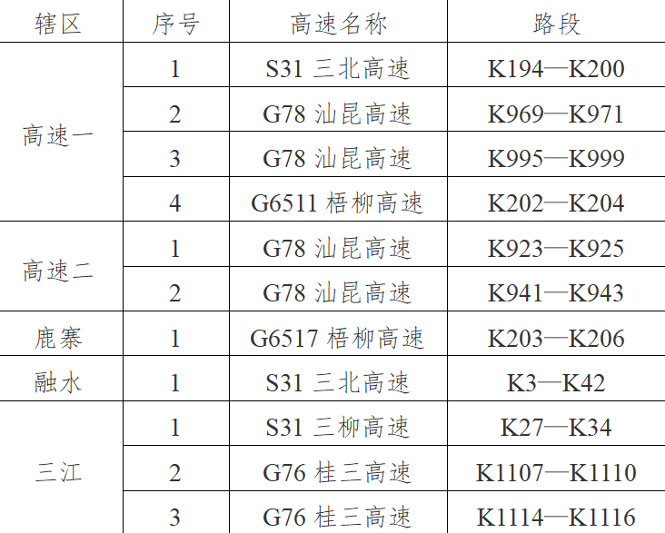 (5)融水辖区:S31三南高速k36至k42,红岭互通;
