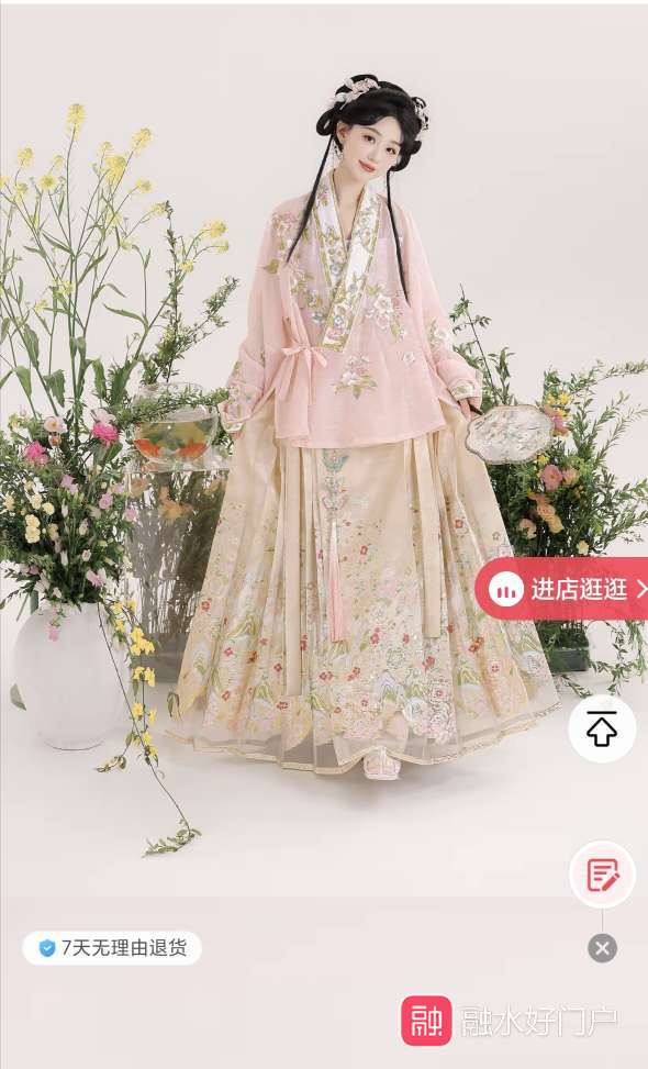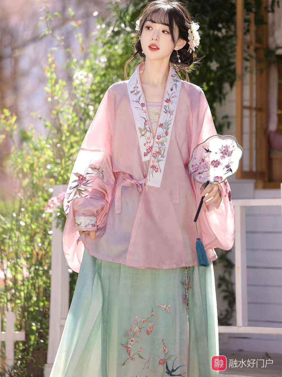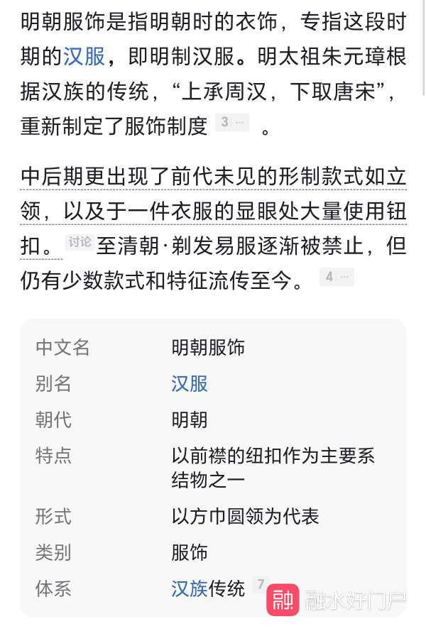 汉服,指的是汉族人的传统服饰,唐宋明秦汉等等时期的服饰都是汉服,有唐制汉服宋制汉服明制汉服等等,现在的旗袍不是汉族服饰。汉服影响了日本韩国还有少民等等,清朝时候是满族当政,强迫汉人和各个少数名族剃发易服,不能穿自己的服饰,只能穿满服,以前的少民都是穿着汉服类的交领右衽或者交领左衽。满清时候汉服就被断带了。但是融水的苗族服饰至今保留了汉族的服饰当中的基本特征,只不过一个是左衽一个是右衽,融水苗族服饰没有受剃发易服的影响,还穿着明制汉服的衍生,没有受剃发易服的影响。  汉服有很多种类,每个时期的又有好多种款式,比如宋制汉服有很多种类,明代汉服也有很多种类。明代时期明太祖朱元璋重新定制了新服饰制度,其中融水苗族保留的是明代汉服当中的“对穿交”汉服,明制汉服通常搭配马面裙穿成一套,上衣是对穿交,下裙是马面裙,如下图是明制汉服