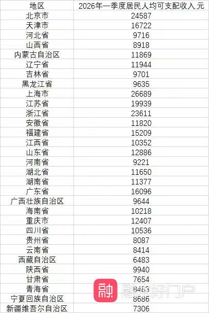 国家统计局网站公布全国31个省份2026年第一季度居民人均可支配收入情况,广西2026年第一季度居民人均可支配收入为9644