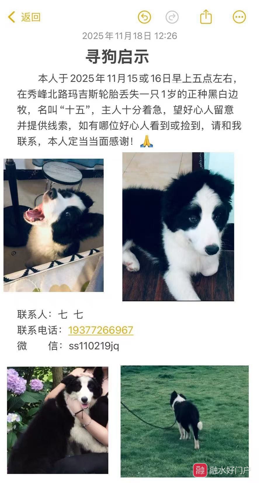 本人于2025年11月14至今丢失一只公狗正种黑白边牧宠物犬 在秀峰北路玛吉斯轮胎61号门店丢失 名为“十五”,主人十分着急,要有好心人看见了或捡到请及时联系我,下面图上有我的联系方式电话和微信号